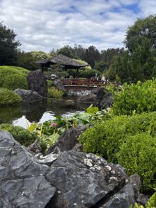 In autumn sunshine, it was a delight to wander in the gardens, to watch koi and ducks in the stream and groups of children, accompanied by parents, running about excitedly near the pavilion, enjoying the unusual wild life and beautiful surroundings. As usual, there was plenty to inspire our haiku: pink-flowering rhododendron bushes, sparkling raked white pebbles, glimpses of the blue, shining bay through the palisade fence, the little Japanese bridge and the gently falling waterfall. We sat at different spots, jotting down haiku ideas, before going back to our meeting room to talk about our published haiku and/or book launches we are preparing, to share a haiku from a poet that had impressed us, and read aloud the haiku we’d brought, triggered by Beverley’s prompt, ‘unpredictable summer weather’.