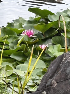 In autumn sunshine, it was a delight to wander in the gardens, to watch koi and ducks in the stream and groups of children, accompanied by parents, running about excitedly near the pavilion, enjoying the unusual wild life and beautiful surroundings. As usual, there was plenty to inspire our haiku: pink-flowering rhododendron bushes, sparkling raked white pebbles, glimpses of the blue, shining bay through the palisade fence, the little Japanese bridge and the gently falling waterfall. We sat at different spots, jotting down haiku ideas, before going back to our meeting room to talk about our published haiku and/or book launches we are preparing, to share a haiku from a poet that had impressed us, and read aloud the haiku we’d brought, triggered by Beverley’s prompt, ‘unpredictable summer weather’.